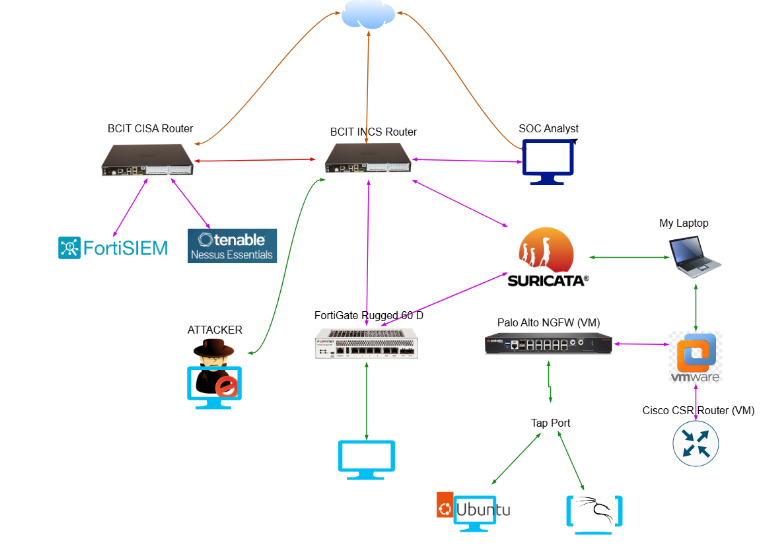 This project simulates a fully functional enterprise-grade Security Operations Center (SOC) environment using Fortinet, Cisco & Palo Alto hardware and integrated cybersecurity platforms (FortiSIEM, Suricata, Tenable Nessus). This project performs Cyberattacks and supports real-time Threat Detection & Monitoring, Incident Response, and continuous Vulnerability Management, showcasing the workflows of a professional Tier I/II SOC Analyst & SIEM Engineer