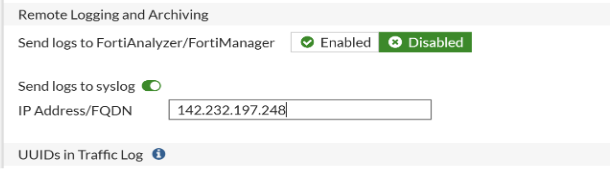 1. Go to Log& Report > Log Settings> Enable Send the Log to syslog and enter the IP Address:142.232.197.248