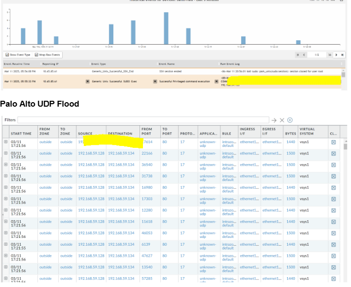 • Connection attempts to closed ports (port 80 on Palo Alto, ICMP Echo DDoS Attack on FortiGate)